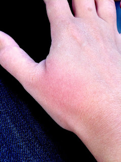But here's my hand today. This happened Saturday. So, Sunday, Monday, Tuesday...five days later, this is what the burn looks like...although you can't see the purple undertones and now the multicolored spots that look like they should have blistered.* It's more painful than it looks.